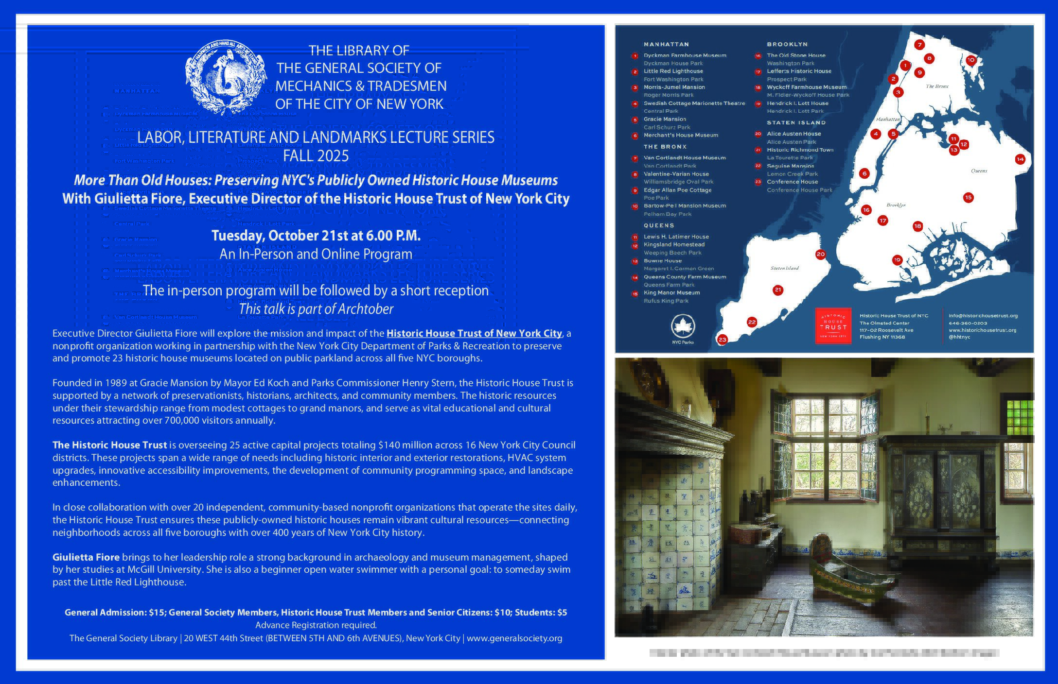 Fall 2025 Lectures Archtober Events Tuesday, October 21st, 6 P.M. – The Historic House Trust of New York City with Giulietta Fiore, Executive Director of HHT Giulietta Fiore will discuss the...